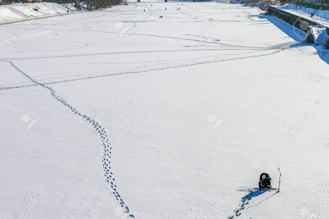Footprints Of The Fisherman , Winter Fisherman Walking On Frozen River Stock Photo Edit Now 1593971038
